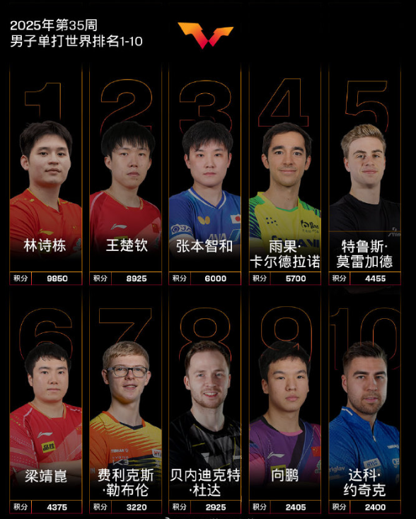 早些时候WTT官方也公布了第35周的世界排名,男单世界前十里有:林诗栋(1)、王楚钦(2)、梁靖崑(6)、向鹏(9)四人。